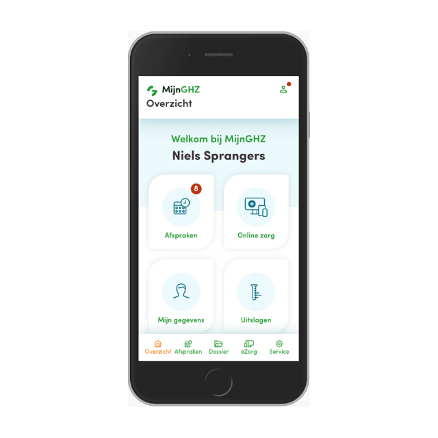 Beveiligde mobiele app waarin een patiënt inzage heeft in persoonlijke en medische gegevens, afspraken kan maken en interactie kan hebben met de zorginstelling.